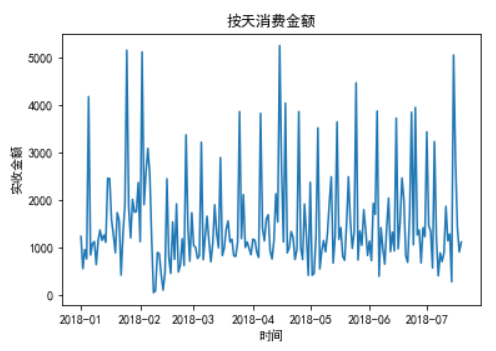 1 import matplotlib.pyplot as plt 2 import matplotlib 3 #画图时用于显示中文字符 4 from pylab import mpl 5 mpl.rcParams['font.sans-serif'] = ['SimHei'] # SimHei是黑体的意思 6 #在操作之前先复制一份 7 #在操作之前先复制一份数据,防止影响清洗后的数据 8 groupDF = data 9 #将'销售时间'设置为index 10 groupDF.index = groupDF['销售时间'] 11 print(groupDF.head()) 12 gb = groupDF.groupby(groupDF.index) 13 print(gb) 14 dayDF = gb.sum() 15 print(dayDF) 16 #画图 17 plt.plot(dayDF['实收金额']) 18 plt.title('按天消费金额') 19 plt.xlabel('时间') 20 plt.ylabel('实收金额') 21 plt.show()