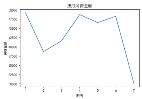 1 #将销售时间聚合按月分组 2 gb = groupDF.groupby(groupDF.index.month) 3 print(gb) 4 monthDF = gb.sum() 5 print(monthDF) 6 plt.plot(monthDF['实收金额']) 7 plt.title('按月消费金额') 8 plt.xlabel('时间') 9 plt.ylabel('实收金额') 10 plt.show()