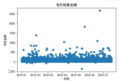 1 plt.scatter(data['销售时间'],data['实收金额']) 2 plt.title('每天销售金额') 3 plt.xlabel('时间') 4 plt.ylabel('实收金额') 5 plt.show()