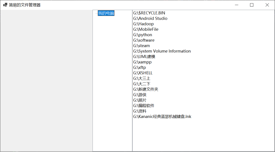 界面设计: partial class Form1 { /// <summary> /// Required designer variable. /// </summary> private System.ComponentModel.IContainer components = null; /// <summary> /// Clean up any resources being used. /// </summary> /// <param name="disposing">true if managed resources should be disposed; otherwise, false.</param> protected override void Dispose(bool disposing) { if (disposing && (components != null)) { components.Dispose(); } base.Dispose(disposing); } #region Windows Form Designer generated code /// <summary> /// Required method for Designer support - do not modify /// the contents of this method with the code editor. /// </summary> private void InitializeComponent() { this.splitContainer1 = new System.Windows.Forms.SplitContainer(); this.treeView1 = new System.Windows.Forms.TreeView(); this.listView1 = new System.Windows.Forms.ListView(); ((System.ComponentModel.ISupportInitialize)(this.splitContainer1)).BeginInit(); this.splitContainer1.Panel2.SuspendLayout(); this.splitContainer1.SuspendLayout(); this.SuspendLayout(); // // splitContainer1 // this.splitContainer1.Dock = System.Windows.Forms.DockStyle.Fill; this.splitContainer1.Location = new System.Drawing.Point(0, 0); this.splitContainer1.Name = "splitContainer1"; // // splitContainer1.Panel2 // this.splitContainer1.Panel2.Controls.Add(this.listView1); this.splitContainer1.Panel2.Controls.Add(this.treeView1); this.splitContainer1.Size = new System.Drawing.Size(1255, 650); this.splitContainer1.SplitterDistance = 418; this.splitContainer1.TabIndex = 0; // // treeView1 // this.treeView1.Dock = System.Windows.Forms.DockStyle.Left; this.treeView1.Location = new System.Drawing.Point(0, 0); this.treeView1.Name = "treeView1"; this.treeView1.Size = new System.Drawing.Size(182, 650); this.treeView1.TabIndex = 0; // // listView1 // this.listView1.Dock = System.Windows.Forms.DockStyle.Fill; this.listView1.Location = new System.Drawing.Point(182, 0); this.listView1.MultiSelect = false; this.listView1.Name = "listView1"; this.listView1.Size = new System.Drawing.Size(651, 650); this.listView1.TabIndex = 1; this.listView1.UseCompatibleStateImageBehavior = false; this.listView1.View = System.Windows.Forms.View.List; this.listView1.SelectedIndexChanged += new System.EventHandler(this.listView1_SelectedIndexChanged); // // Form1 // this.ClientSize = new System.Drawing.Size(1255, 650); this.Controls.Add(this.splitContainer1); this.Name = "Form1"; this.Text = "简易的文件管理器"; this.splitContainer1.Panel2.ResumeLayout(false); ((System.ComponentModel.ISupportInitialize)(this.splitContainer1)).EndInit(); this.splitContainer1.ResumeLayout(false); this.ResumeLayout(false); } #endregion private SplitContainer splitContainer1; private ListView listView1; private TreeView treeView1; }