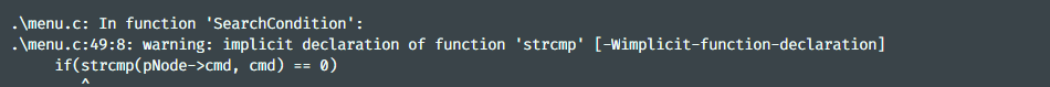 经判断缺少头文件 string.h ,在 menu.c 的首部添加 #include <string.h> 后重新编译
