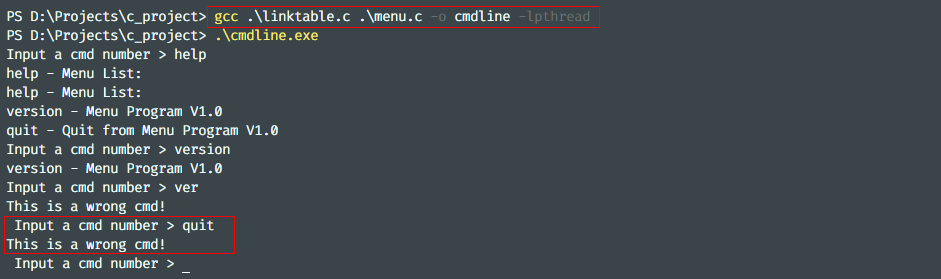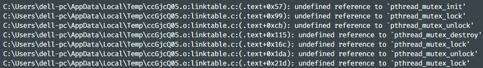 百度后发现原因是缺少头文件 pthread.h ,在 linktable.c 中添加 #include <pthread.h> 并修改编译命令为:gcc .\linktable.c .\menu.c -o cmdline -lpthread