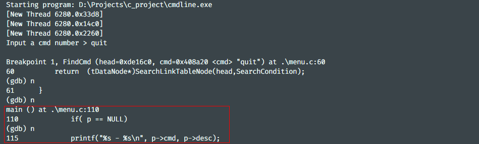 重新编译生成可调试的可执行程序:gcc -g .\linktable.c .\menu.c -o cmdline -lpthread