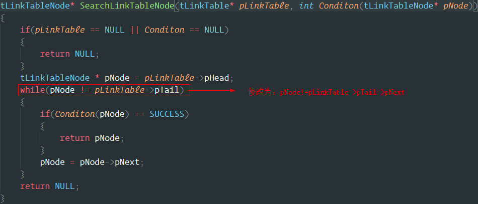结合源码分析,问题出在 while 循环条件,最后对 quit 的判断没能进行,所以这里修改 while 循环条件为 while(pNode != pLinkTable->pTail->pNext)。