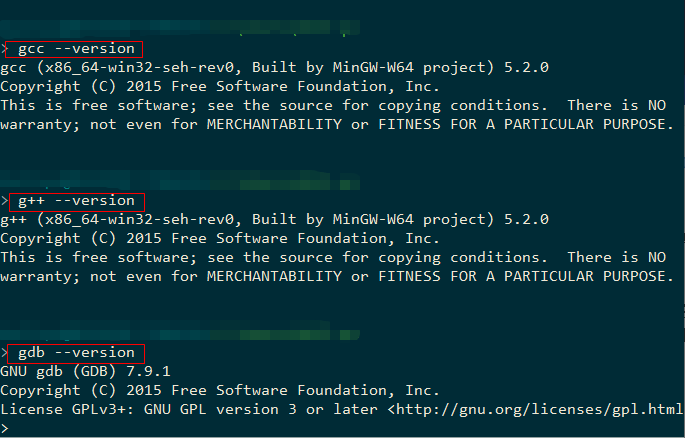 命令行下输入相应命令,检查 gcc、g++、gdb 是否配置成功: