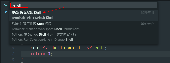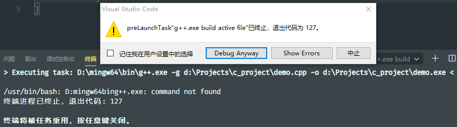发现如图弹窗报错,经分析发现当前终端配置的是 bash, 应选择 cmd 或 powershell,具体做法:按 Ctrl + Shift + P ,然后输入 shell 筛选,选择默认Shell为cmd(或者 Powershell)。
