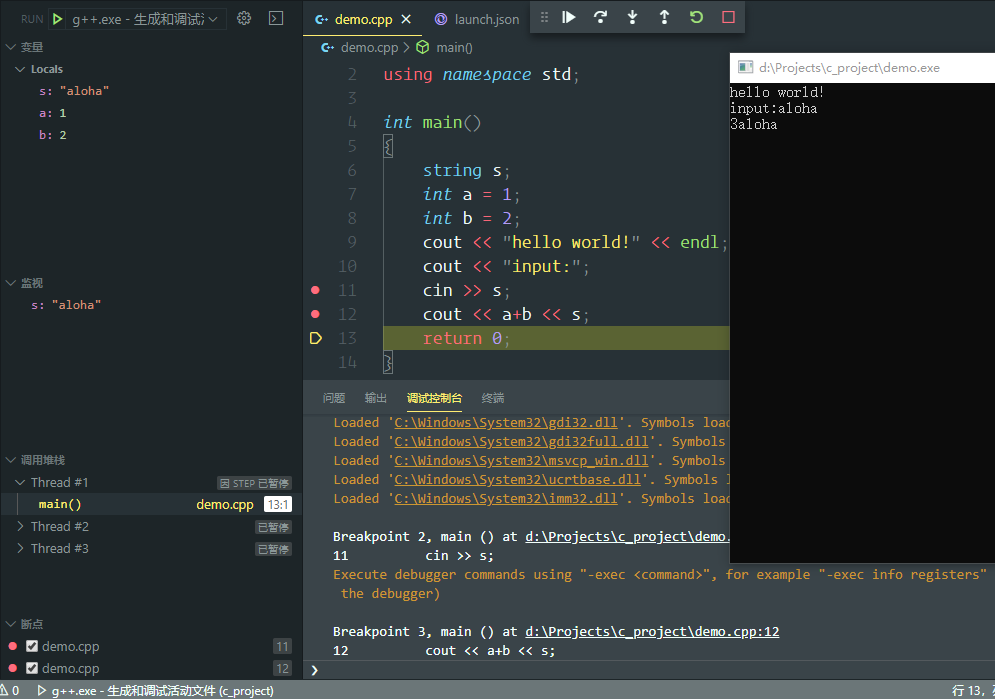 插件安装成功后,编写测试c++代码,保存后按 F5 启动调试: