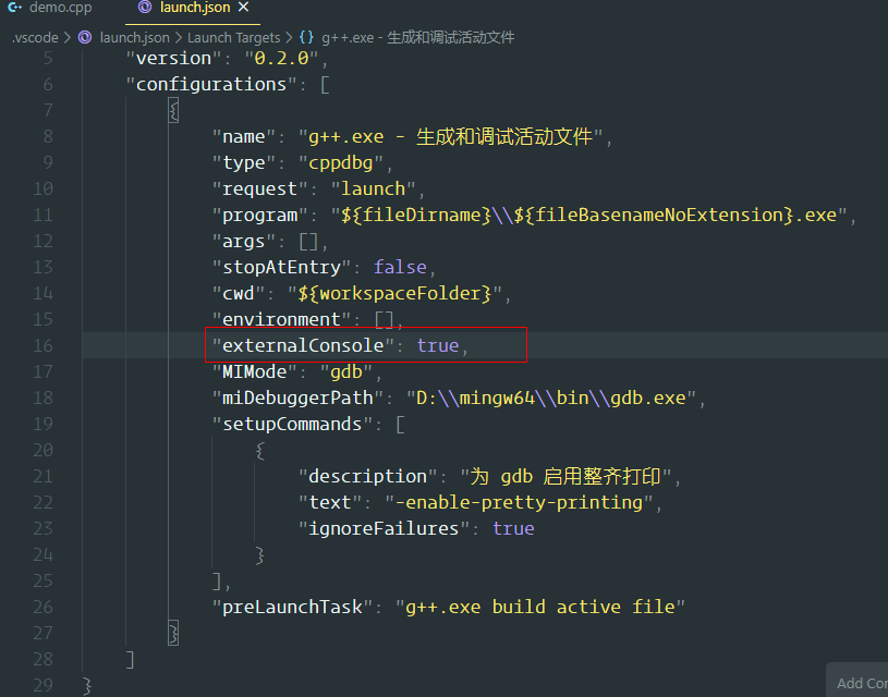 【注】这里使用外部控制台运行生成的可执行程序,需要在launch.json里配置下参数,即将 "externalConsole": false, 的false改为true即可。