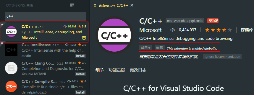 首先,在vscode下进入插件管理界面,搜索C++,安装如下插件