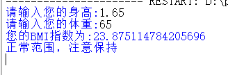 (1)在实例1的基础上,修改为使用input()函数输入身高和体重。代码如下: