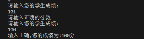 public static void four() { int i = 0; while(i == 0){ System.out.println("请输入您的学生成绩:"); int score = input.nextInt(); if(score<0 || score>100){ System.out.println("请输入正确的分数"); }else{ System.out.println("输入正确,您的成绩为:"+score+"分"); i+=1; } } menu(); }