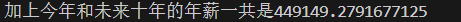 public static void five() { double annual_salary = 30000; double growth_rate = 0.06; double growth = 0; double new_annual_salary = 0; double sum = 30000; for(int i = 1; i<11;i++){ growth = annual_salary*growth_rate; new_annual_salary = growth + annual_salary; annual_salary = new_annual_salary; sum +=annual_salary; } System.out.println("加上今年和未来十年的年薪一共是"+sum); menu(); }