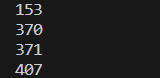 public static void six(){ for(int j = 100; j<1000;j++){ int ge = j%10; int shi = j%100/10; int bai = j/100; if(j == ge*ge*ge+shi*shi*shi+bai*bai*bai){ System.out.println(j); } } menu(); }