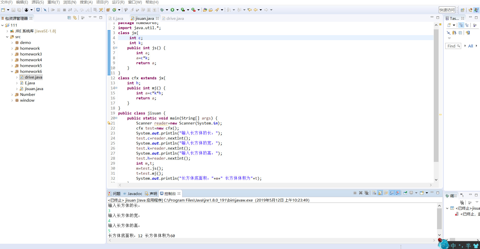 (3)编写一个测试类,对以上两个类进行测试,创建一个长方体,定义其长、宽、高,输出其底面积和体积。