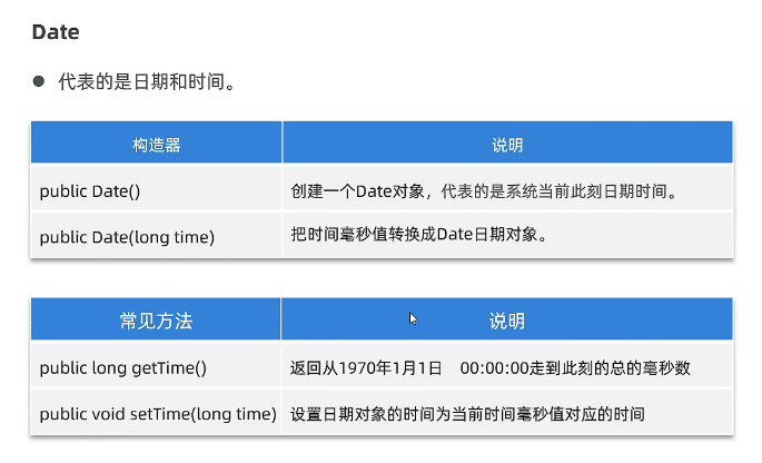 public class Test1Date { public static void main(String[] args) { //目标:掌握Date日期类的使用 //1、创建一个Date的对象,代表系统当前时间信息 Date d = new Date(); System.out.println(d); //2、拿到时间毫秒值 long time = d.getTime(); System.out.println(time); //3、把时间毫秒值转换成日期对象,time的单位是毫秒,所以要*1000 time += 2 * 1000; Date d2 = new Date(time); System.out.println(d2); //4、直接把日期对象的时间通过setTime方法进行修改 Date d3 = new Date(); d3.setTime(time); System.out.println(d3); } }