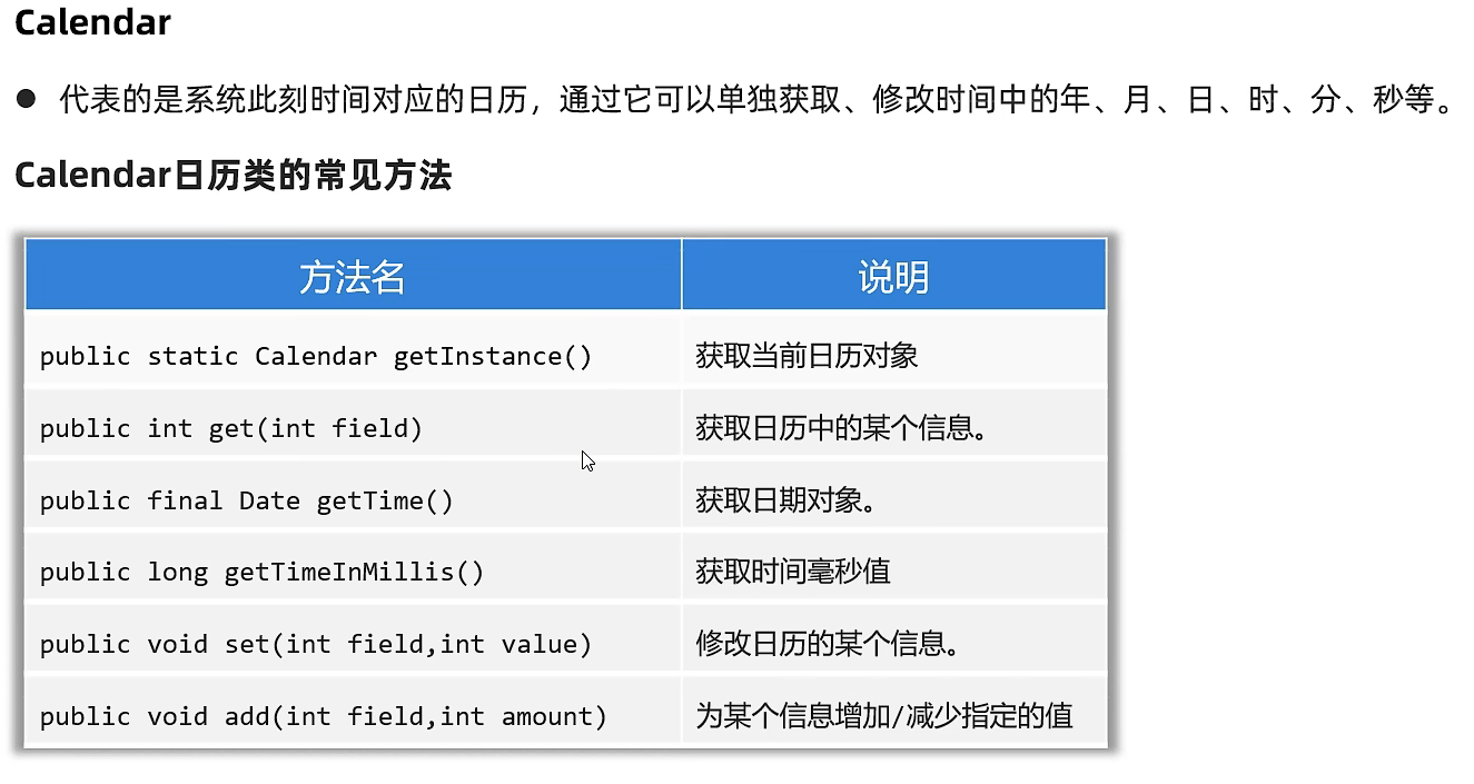 //目标:掌握Calendar的使用和特点 //1、得到系统此刻时间对应的日历对象 Calendar now = Calendar.getInstance(); System.out.println(now); //2、获取日历中的某个信息 int year = now.get(Calendar.YEAR); System.out.println(year); int days = now.get(Calendar.DAY_OF_YEAR); System.out.println(days); //3、拿到日历中记录的日期对象 Date d = now.getTime(); System.out.println(d); //4、拿到时间毫秒值 long time = now.getTimeInMillis(); System.out.println(time); //5、修改日历中的某个信息 now.set(Calendar.YEAR,2024); System.out.println(now);
