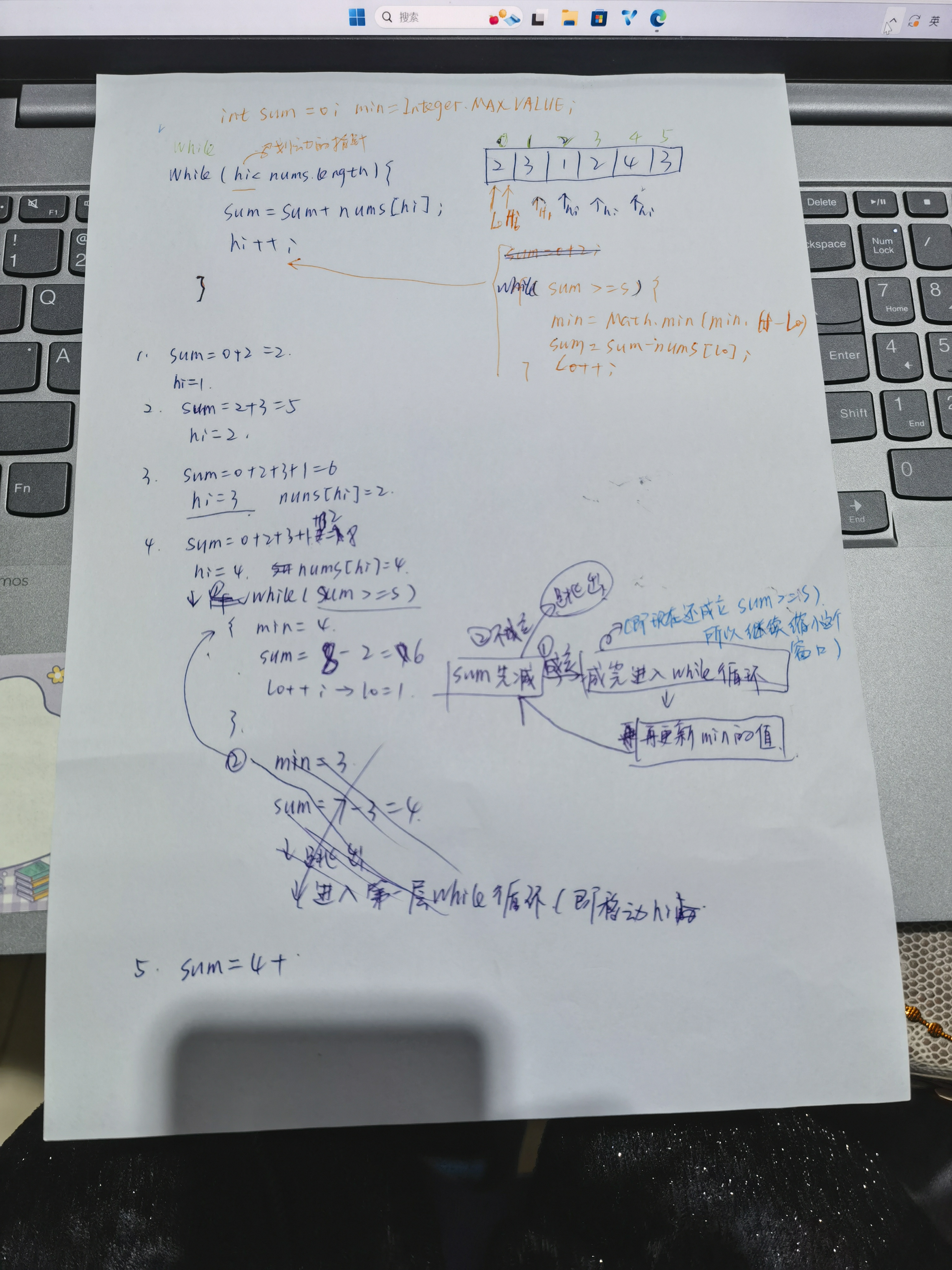 class Solution { public int minSubArrayLen(int target, int[] nums) { //l = low, h = high, sum用来记录滑动窗口的总值 //h用来滑动(或者说h用来入队,l用来出队) int l = 0, h = 0, sum = 0; int min = Integer.MAX_VALUE; while (h < nums.length) { sum += nums[h]; h++; while (sum >= target) { min = Math.min(min, h - l); //因为是先加的,h又移动的,所以直接h-l,不用再+1 sum -= nums[l]; //出队 l++; } } return min == Integer.MAX_VALUE ? 0 : min; } }