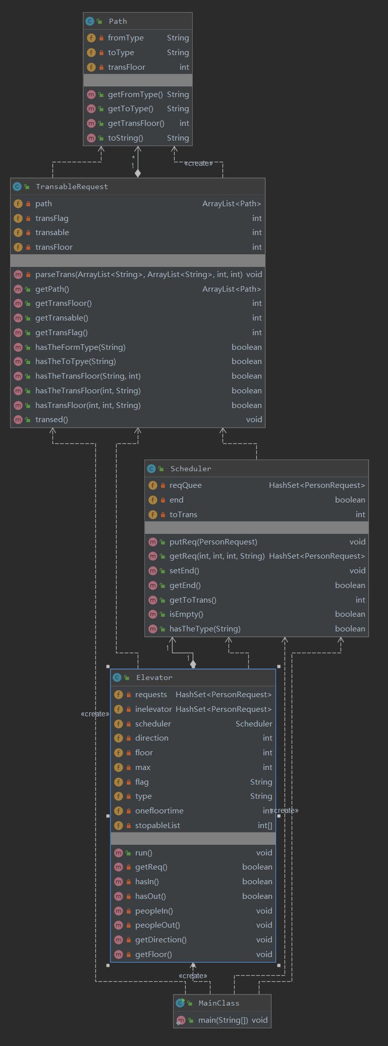 2、电梯类Elevator,新增题设的可变属性,比如类型、最大负载等,而且对于需换乘而尚未换乘的乘客,会在其下电梯时调用putReq()方法将其加入主请求队列;