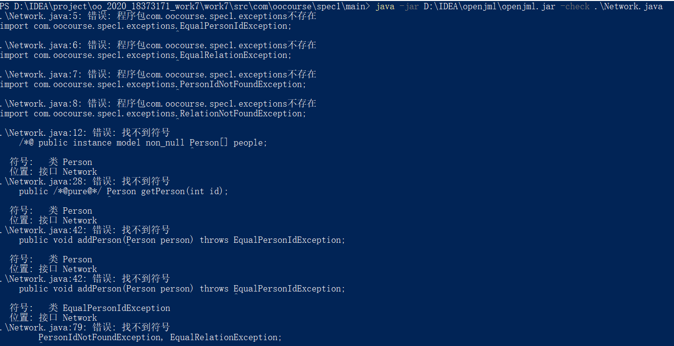 本人采用如上命令对第九次作业中的官方包里的Person.java文件进行了JML语法检查,最后没有任何输出,表示没有语法错误,然而开始检查NetWork.java时就出现了以下问题: