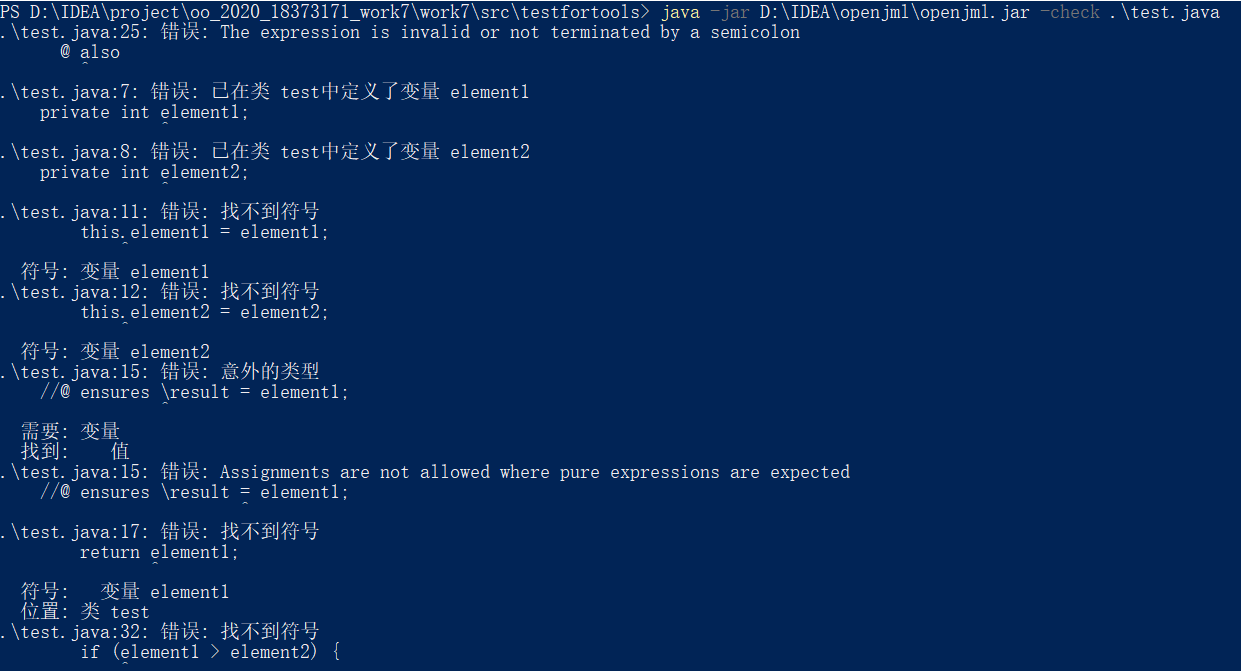 令人欣喜的是,它似乎找到了我故意写的将\result赋值的错误和ensuers后没有加分号的错误,至于其他报错,本人怀疑是它一并将实现代码作为JML检查了,毕竟我将实现代码删去后,这些报错就消失了。