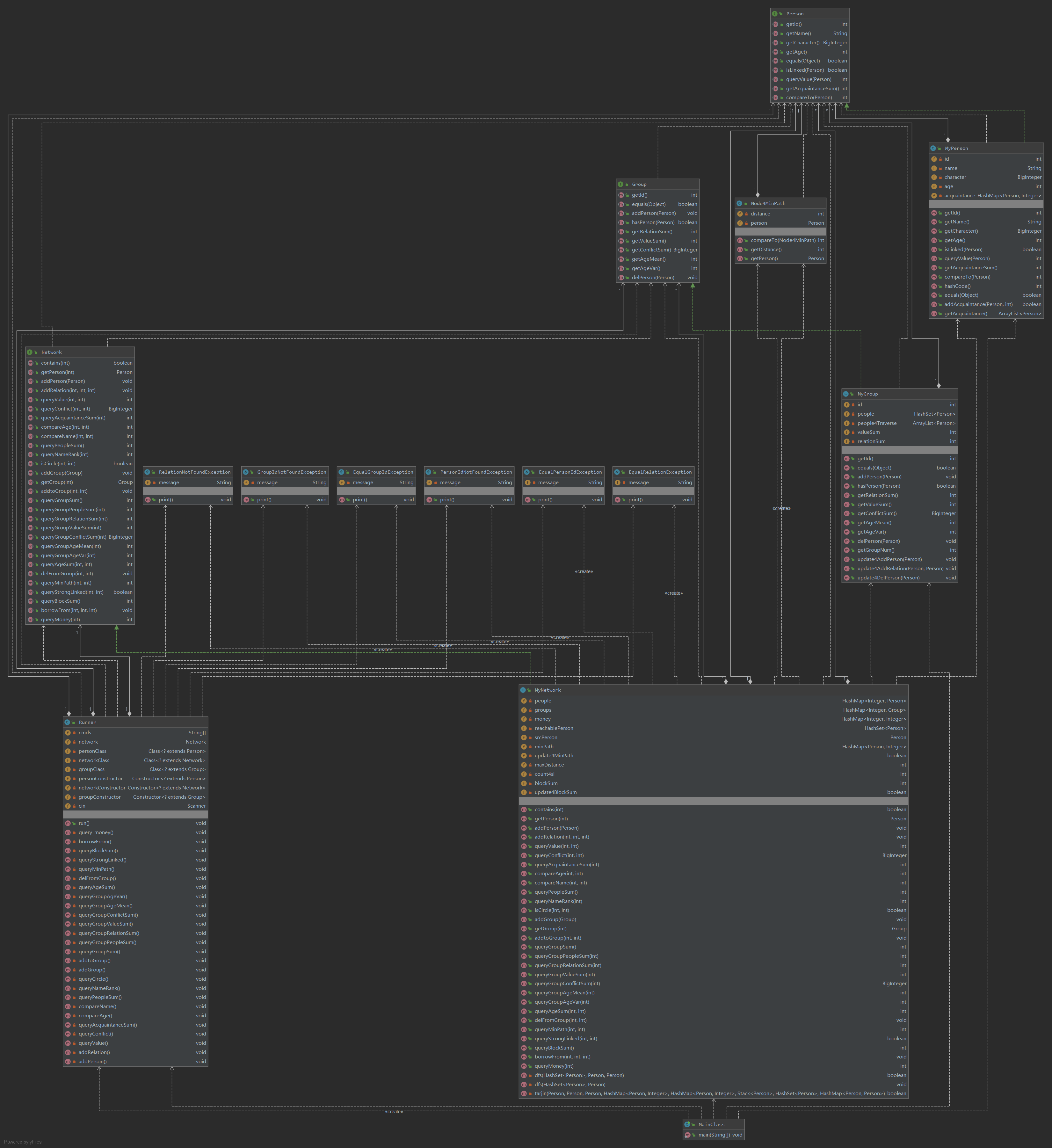 这次作业的话,难点在于Group里新加的getRelationSum和getValueSum两个方法,最开始设计时采用的是O(n^2)的每次都遍历查询的方法,但是果然CTLE了,在修复的时候就对这relationSum和valueSum进行了缓存,每次往组里加人或添加关系时就进行更新。除此之外,互测时在isCircle上也被卡了CTLE,最后决定在每次调用isCircle后,都将访问过的连通图保存下来,下次调用时,若节点都在保存的连通图内,则可以直接返回true。