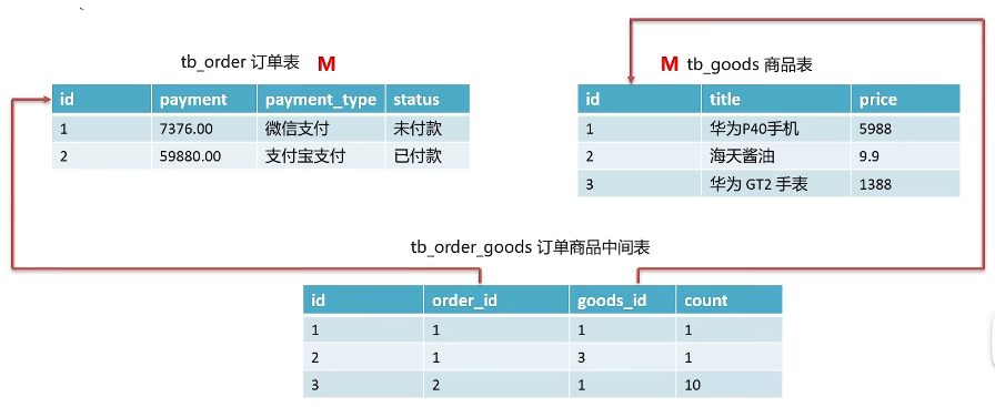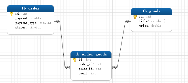 -- 订单表 create table tb_order( id int primary key auto_increment, payment double (10,2), payment_type TINYINT, status TINYINT ); -- 商品表 create table tb_goods( id int primary key auto_increment, title varchar(100), price double(10,2) ); -- 订单商品中间表 create table tb_order_goods( id int primary key auto_increment, order_id int, goods_id int, count int ); -- 建完表后添加外键 alter table tb_order_goods add constraint fk_order_id foreign key (order_id) REFERENCES tb_order(id); alter table tb_order_goods add constraint fk_goods_id foreign key (goods_id) REFERENCES tb_goods(id);
