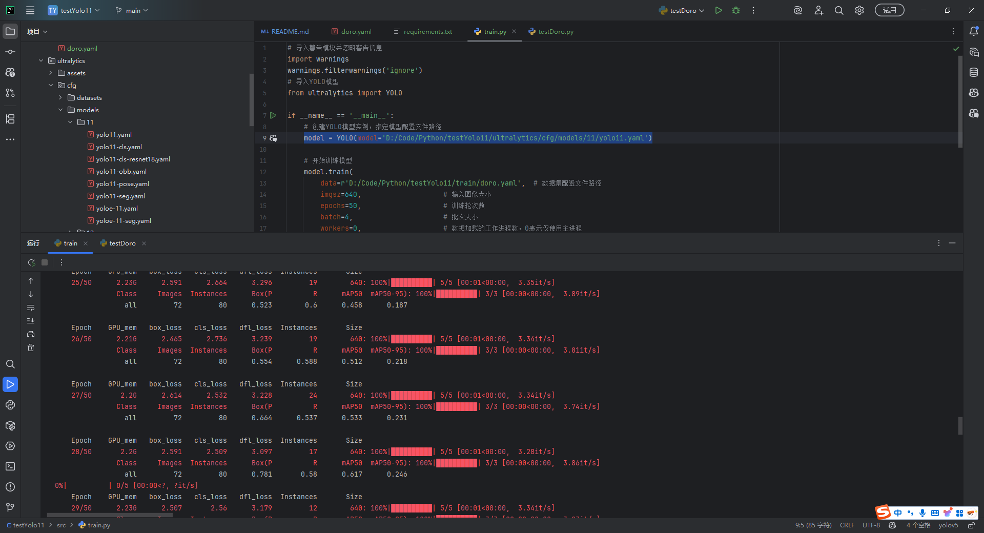data=r'D:/Code/Python/testYolo11/train/doro.yaml', # 数据集配置文件路径