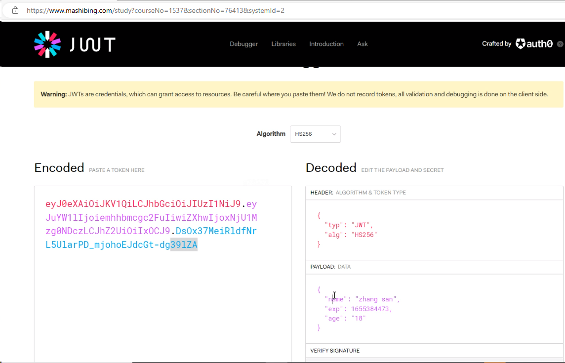 DecodedJWT verify = JWT.require(Algorithm.HMAC256(SIGN)).build().verify(token);