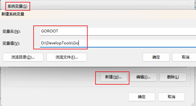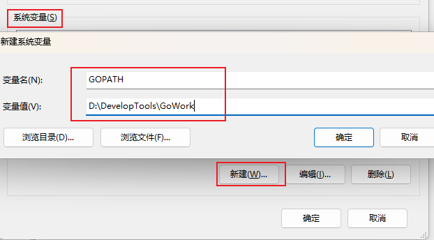 在环境变量的系统变量中,新建并配置 GOROOT(配置安装目录) 和 GOPATH(配置工作目录,用于代码存储) 环境变量,然后将用户变量中的GOPATH也修改成系统变量的GOPATH路径
