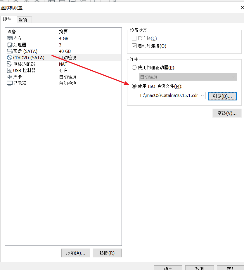 然后在“ CD/DVD(SATA)”选项卡中,选择使用ISO镜像文件