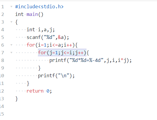 数据处理:使用for循环的嵌套,for(i=1;i<=a;i++),for(j=1;j<=i;j++)