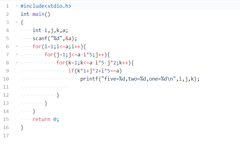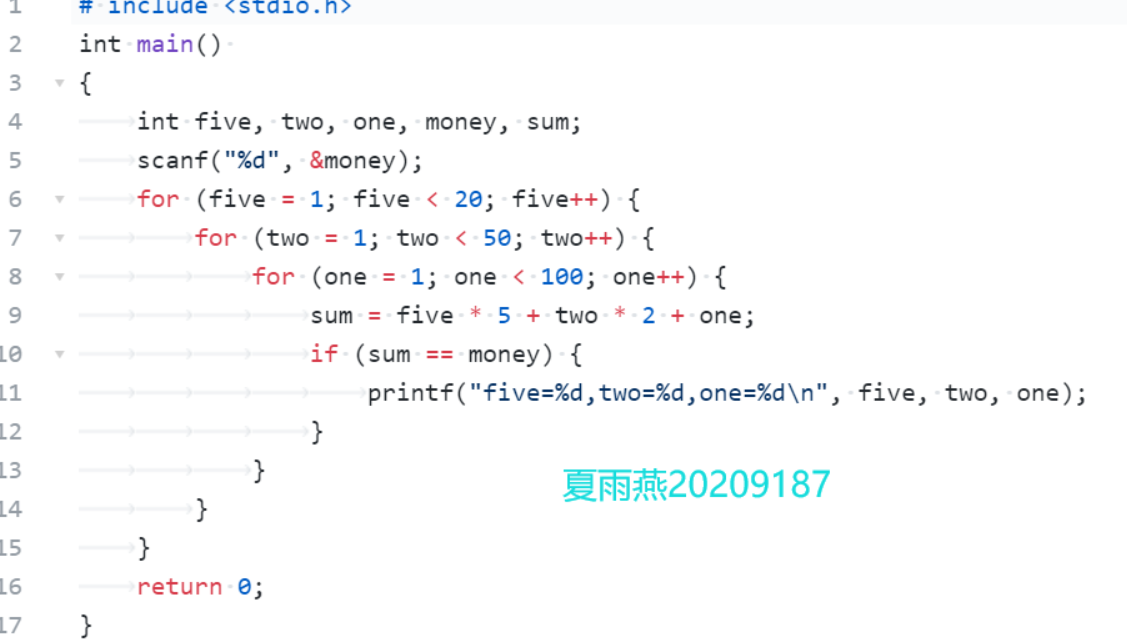 1.与第一位同学的循环的条件不一样,她根据题目条件零钱数额,五元数量,两元数量和一元数量都有最大值。