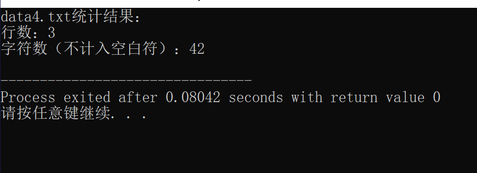 1 #include<stdio.h> 2 #include<ctype.h> 3 4 int main(){ 5 FILE *fp; 6 char a; 7 int b=0,c=0; 8 9 fp=fopen("data4.txt","r"); 10 if(fp==NULL){ 11 printf("fail to open the text"); 12 return -1; 13 } 14 15 while((a=fgetc(fp))!=EOF){ 16 if(isalnum(a)){ 17 c++; 18 } 19 if(a=='-'){ 20 c++; 21 } 22 if(a=='\n'){ 23 b++; 24 } 25 } 26 27 fclose(fp); 28 printf("data4.txt统计结果:\n"); 29 printf("行数:%d\n",b+1); 30 printf("字符数(不计入空白符):%d\n",c); 31 32 return 0; 33 }