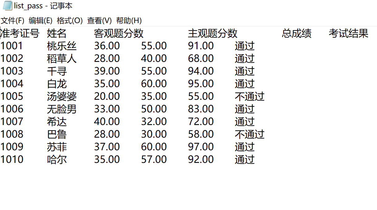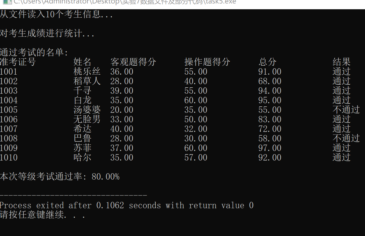 1 #include <stdio.h> 2 #include <string.h> 3 #define N 10 4 5 typedef struct { 6 long id; // 准考证号 7 char name[20]; // 姓名 8 float objective; // 客观题得分 9 float subjective; // 操作题得分 10 float sum; // 总分 11 char result[10]; // 考试结果 12 } STU; 13 14 // 函数声明 15 void read(STU st[], int n); 16 void write(STU st[], int n); 17 void output(STU st[], int n); 18 int process(STU st[], int n, STU st_pass[]); 19 20 int main() { 21 STU stu[N], stu_pass[N]; 22 int cnt; 23 double pass_rate; 24 25 printf("从文件读入%d个考生信息...\n", N); 26 read(stu, N); 27 28 printf("\n对考生成绩进行统计...\n"); 29 cnt = process(stu, N, stu_pass); 30 31 printf("\n通过考试的名单:\n"); 32 output(stu, N); // 输出所有考生完整信息到屏幕 33 write(stu, N); // 输出考试通过的考生信息到文件 34 35 pass_rate = 1.0 * cnt / N; 36 printf("\n本次等级考试通过率: %.2f%%\n", pass_rate*100); 37 38 return 0; 39 } 40 41 // 把所有考生完整信息输出到屏幕上 42 // 准考证号,姓名,客观题得分,操作题得分,总分,结果 43 void output(STU st[], int n) { 44 int i; 45 46 printf("准考证号\t姓名\t客观题得分\t操作题得分\t总分\t\t结果\n"); 47 for (i = 0; i < n; i++) 48 printf("%ld\t\t%s\t%.2f\t\t%.2f\t\t%.2f\t\t%s\n", st[i].id, st[i].name, st[i].objective, st[i].subjective, st[i].sum, st[i].result); 49 } 50 51 // 从文本文件examinee.txt读入考生信息:准考证号,姓名,客观题得分,操作题得分 52 void read(STU st[], int n) { 53 int i; 54 FILE *fin; 55 56 fin = fopen("examinee.txt", "r"); 57 if (!fin) { 58 printf("fail to open file\n"); 59 return; 60 } 61 62 while (!feof(fin)) { 63 for (i = 0; i < n; i++) 64 fscanf(fin, "%ld %s %f %f", &st[i].id, st[i].name, &st[i].objective, &st[i].subjective); 65 } 66 67 fclose(fin); 68 } 69 70 // 把通过考试的考生完整信息写入文件list_pass.txt 71 // 准考证号,姓名,客观题得分,操作题得分,总分,结果 72 void write(STU st[], int n) { 73 FILE *fp; 74 int i; 75 fp=fopen("list_pass.txt","w"); 76 if(fp == NULL){ 77 printf("无法打开文件\n"); 78 return; 79 } 80 fprintf(fp,"准考证号\t姓名\t客观题分数\t主观题分数\t总成绩\t考试结果\n"); 81 for (i=0;i<n;i++) { 82 fprintf(fp,"%d\t%s\t%.2f\t%.2f\t%.2f\t%s\n",st[i].id,st[i].name,st[i].objective,st[i].subjective,st[i].sum,st[i].result); 83 } 84 fclose(fp); 85 } 86 87 // 对考生信息进行处理:计算每位考生考试总分、结果;统计考试通过的人数 88 int process(STU st[], int n, STU st_pass[]) { 89 int i,j=0; 90 for (i=0;i<n;i++){ 91 st[i].sum=st[i].objective+st[i].subjective; 92 if (st[i].sum>=60){ 93 strcpy(st[i].result,"通过"); 94 st_pass[j++]=st[i]; 95 } 96 else{ 97 strcpy(st[i].result,"不通过"); 98 } 99 } 100 return j; 101 }