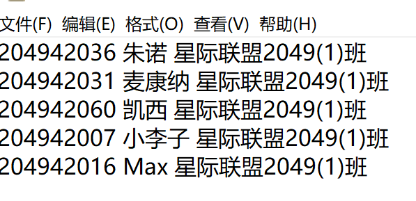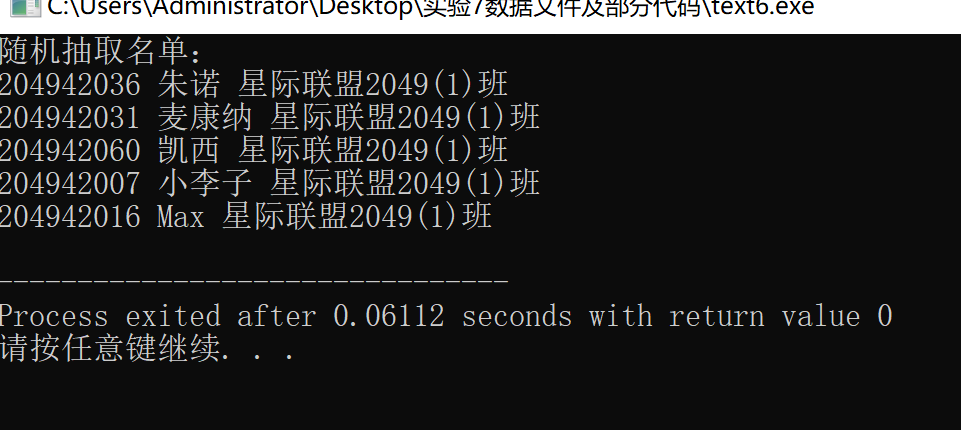 1 #include <stdio.h> 2 #include <stdlib.h> 3 #include <time.h> 4 5 // 定义学生结构体 6 typedef struct { 7 int id; 8 char name[20]; 9 char class[20]; 10 } Student; 11 12 // 读取学生信息 13 void readStudents(Student students[], int *n) { 14 FILE *fp; 15 fp = fopen("list.txt", "r"); 16 if (fp == NULL) { 17 printf("无法打开文件\n"); 18 exit(1); 19 } 20 *n = 0; 21 while (fscanf(fp, "%d %s %s", &students[*n].id, students[*n].name, students[*n].class) == 3) { 22 (*n)++; 23 } 24 fclose(fp); 25 } 26 27 // 随机抽取学生 28 void selectStudents(Student students[], int n, Student selected[], int m) { 29 int i, j, index; 30 srand((unsigned int)time(NULL)); 31 for (i = 0; i < m; i++) { 32 index = rand() % n; 33 selected[i] = students[index]; 34 for (j = index; j < n - 1; j++) { 35 students[j] = students[j + 1]; 36 } 37 n--; 38 } 39 } 40 41 // 显示学生信息 42 void displayStudents(Student selected[], int m) { 43 int i; 44 printf("随机抽取名单:\n"); 45 for (i = 0; i < m; i++) { 46 printf("%d %s %s\n", selected[i].id, selected[i].name, selected[i].class); 47 } 48 } 49 50 // 写入文件 51 void writeStudents(Student selected[], int m, char *filename) { 52 FILE *fp; 53 int i; 54 fp = fopen(filename, "w"); 55 if (fp == NULL) { 56 printf("无法打开文件\n"); 57 exit(1); 58 } 59 for (i = 0; i < m; i++) { 60 fprintf(fp, "%d %s %s\n", selected[i].id, selected[i].name, selected[i].class); 61 } 62 fclose(fp); 63 } 64 65 int main() { 66 Student students[80]; 67 Student selected[5]; 68 int n; 69 70 readStudents(students, &n); 71 selectStudents(students, n, selected, 5); 72 displayStudents(selected, 5); 73 writeStudents(selected, 5, "20241222.list"); 74 75 return 0; 76 }