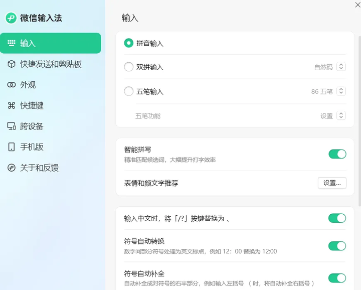 4.进入页面可以有很多设置,可以按自己喜欢的设置。输入支持:拼音、双拼、五笔等,也可以智能拼写,表情包等一系列的设置,还有很多设置,比如快捷键、外观皮肤主题等自己去体验