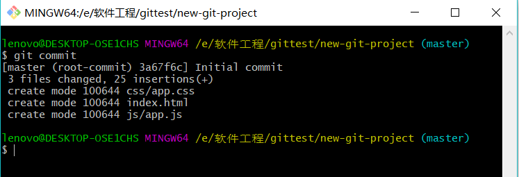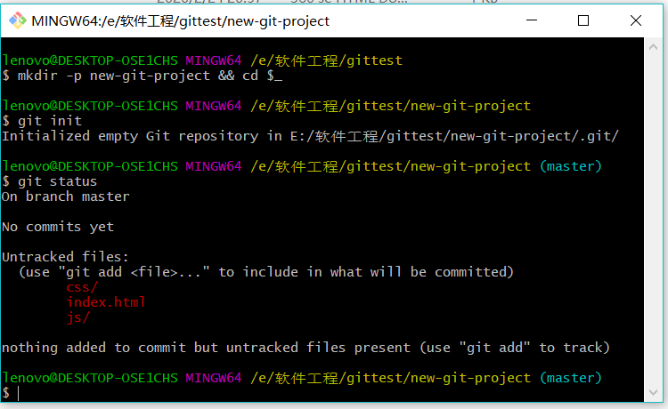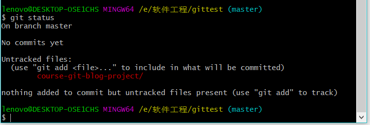 因为是在空目录中输入的,命令故显示的结果为No commits yet为尚未有任何提交