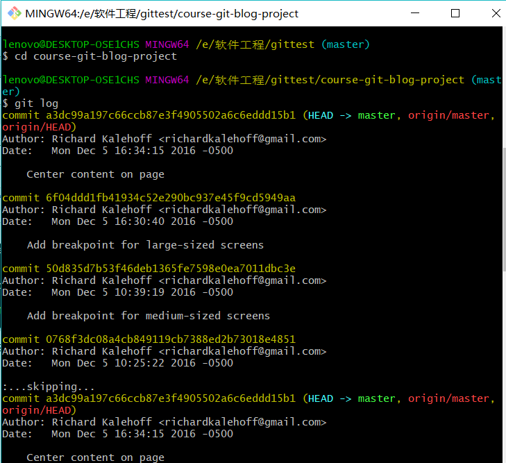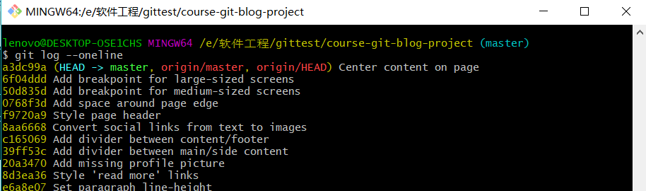 git log命令用于显示仓库中所有commit的信息,默认情况下会显示仓库中每个 commit 的:SHA、作者、日期、消息