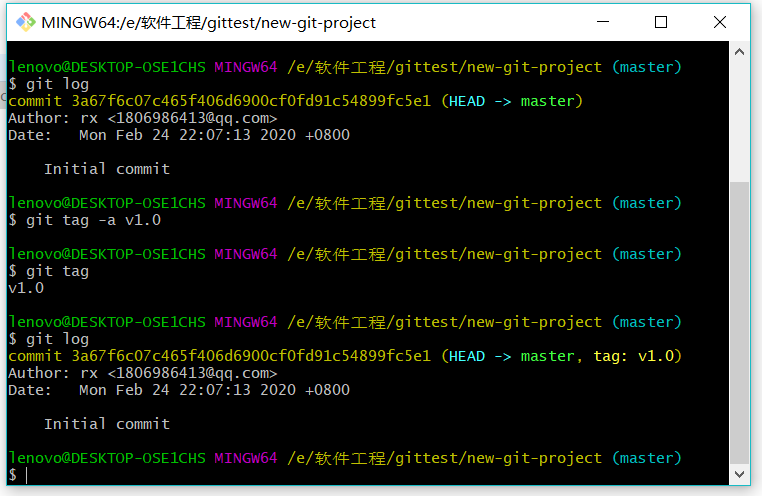 输出结果显示的 tag: v1.0 ,这就是标签,标签与 commit 相绑定。因此,该标签与 commit 的 SHA 位于同一行。