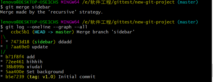 首先将两个分支进行合并,合并完后进行git log --oneline --graph --all