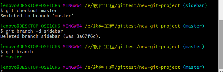 删除分支:在删除分支时,无法删除当前所在的分支;若你要删除的分支上有commit则不能进行删除,此时需要强制删除,用大写D来代替小写d进行删除。