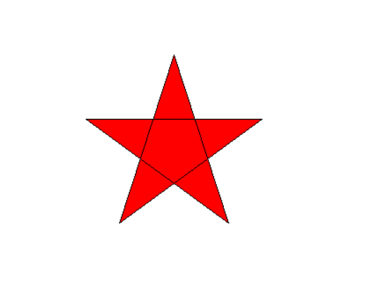 import turtle turtle.pensize(1 ) turtle.pencolor("black") turtle.fillcolor("red") turtle.begin_fill() for i in range(5): turtle.forward(200) turtle.right(180-36) turtle.forward(200) turtle.left(-144) turtle.end_fill() turtle.hideturtle() #隐藏画笔 turtle.done() #结束绘制