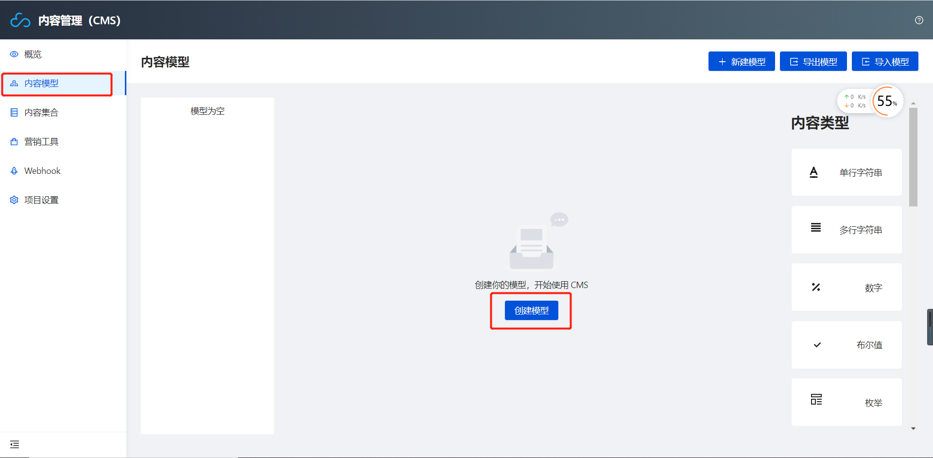 7.点击内容模型,创建模型,创建完成后,在云数据库即可查看相关集合内容