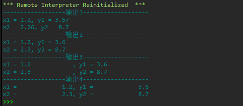 print('x1 = {:.1f}, y1 = {:.1f}'.format(x1, y1)) #{:.1f}控制小数输出精度,保留1位