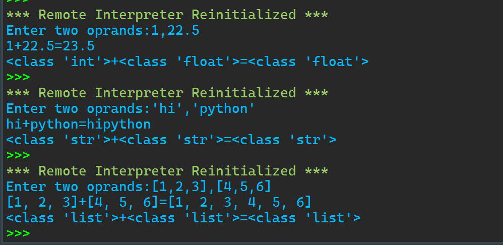 1 #组合使用内置函数eval()和input() 2 3 x,y =eval(input('Enter two oprands:')) #输入的两个操作数之间用逗号分隔(英文半角输入以下的逗号) 4 ans = x + y 5 6 print(f'{x}+{y}={ans}') 7 print(f'{type(x)}+{type(y)}={type(ans)}')