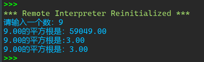 1 #简单的数学计算 2 import math 3 4 n = float(input('请输入一个数:')) 5 6 #python中计算开平方的三种方式 7 ans1=n**5 8 ans2=pow(n,0.5) 9 ans3=math.sqrt(n) 10 11 print('%.2f的平方根是:%.2f'%(n,ans1)) #以传统方式(%)输出 12 print('{:.2f}的平方根是:{:.2f}'.format(n,ans2)) #使用str.format()方式输出 13 print(f'{n:.2f}的平方根是:{ans3:.2f}') #使用f-string方式输出