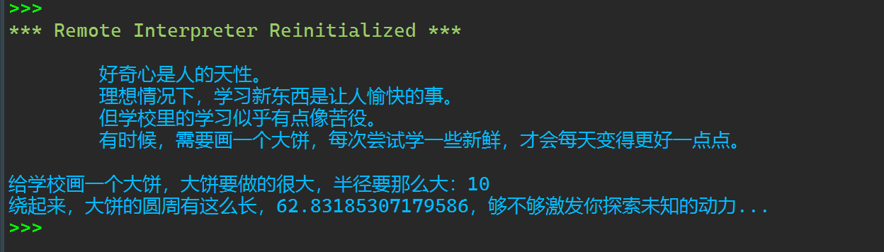 1 #神奇的pi,与大饼 2 3 import math 4 5 text = ''' 6 好奇心是人的天性。 7 理想情况下,学习新东西是让人愉快的事。 8 但学校里的学习似乎有点像苦役。 9 有时候,需要画一个大饼,每次尝试学一些新鲜,才会每天变得更好一点点。 10 ''' 11 print(text) 12 13 r=float(input('给学校画一个大饼,大饼要做的很大,半径要那么大:')) 14 15 circle=2*math.pi*r 16 17 print(f'绕起来,大饼的圆周有这么长,{circle},够不够激发你探索未知的动力...')