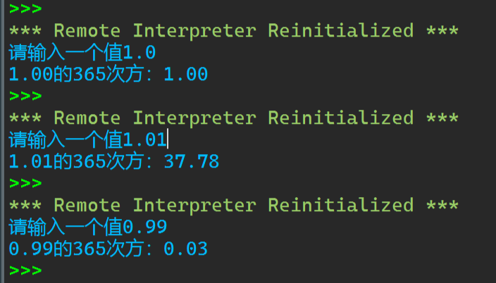 1 x=eval(input('请输入一个值')) 2 y=pow(x,365) 3 print(f'{x:.2f}的365次方:{y:.2f}')
