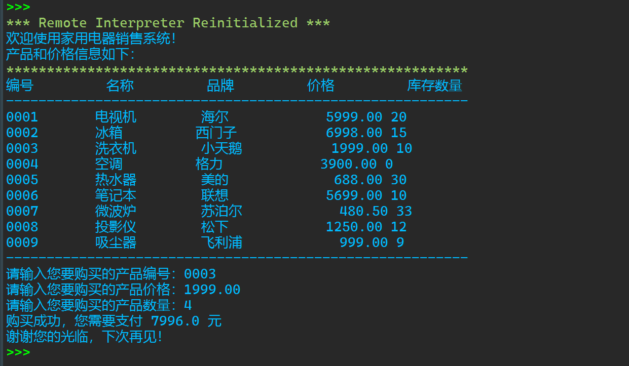 1 """ 2 家用电器销售系统 3 v1.0 4 """ 5 6 #欢迎信息 7 print('欢迎使用家用电器销售系统!') 8 9 #产品信息列表 10 print('产品和价格信息如下:') 11 print('**************************************************************') 12 print(f"{'编号':<10s}{'名称':<10s}{'品牌':<10s}{'价格':<10s}{'库存数量':<10s}") 13 print('--------------------------------------------------------------') 14 print(f"000{'1':<7s}{'电视机':<10s}{'海尔':<10s}{5999:<15.2f}{'20':<10s}") 15 print(f"000{'2':<7s}{'冰箱':<10s}{'西门子':<10s}{6998:<15.2f}{'15':<10s}") 16 print(f"000{'3':<7s}{'洗衣机':<10s}{'小天鹅':<10s}{1999:<15.2f}{'10':<10s}") 17 print(f"000{'4':<7s}{'空调':<10s}{'格力':<10s}{3900:<15.2f}{'0':<10s}") 18 print(f"000{'5':<7s}{'热水器':<10s}{'美的':<10s}{688:<15.2f}{'30':<10s}") 19 print(f"000{'6':<7s}{'笔记本':<10s}{'联想':<10s}{5699:<15.2f}{'10':<10s}") 20 print(f"000{'7':<7s}{'微波炉':<10s}{'苏泊尔':<10s}{480.5:<15.2f}{'33':<10s}") 21 print(f"000{'8':<7s}{'投影仪':<10s}{'松下':<10s}{1250:<15.2f}{'12':<10s}") 22 print(f"000{'9':<7s}{'吸尘器':<10s}{'飞利浦':<10s}{999:<15.2f}{'9':<10s}") 23 24 print('--------------------------------------------------------------') 25 26 #用户输入信息 27 product_id=input('请输入您要购买的产品编号:') 28 price=float(input('请输入您要购买的产品价格:')) 29 count=int(input('请输入您要购买的产品数量:')) 30 31 #计算金额 32 print('购买成功,您需要支付',price*count,'元') 33 34 #退出系统 35 print('谢谢您的光临,下次再见!')