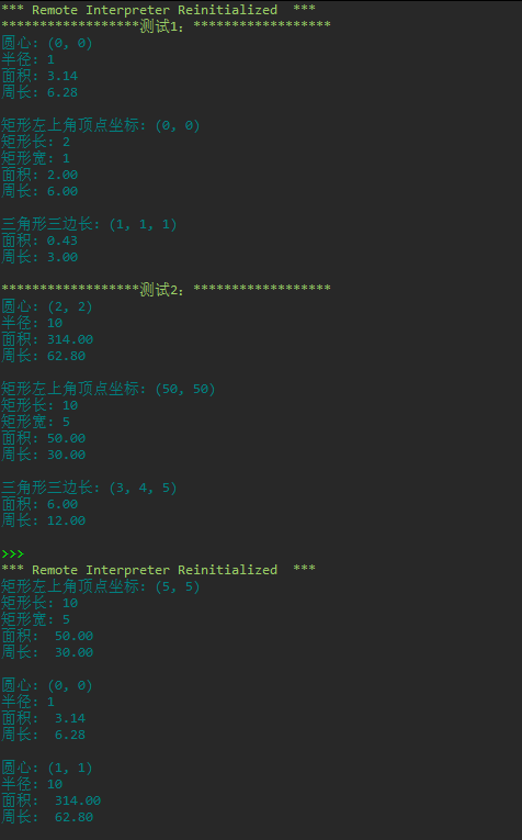 1 from shape import Rect, Circle 2 shape_lst = [Rect(5, 5, 10, 5), Circle(), Circle(1, 1, 10)] 3 for i in shape_lst: 4 i.info() 5 print(f'面积: {i.area(): .2f}') 6 print(f'周长: {i.perimeter(): .2f}') 7 print()